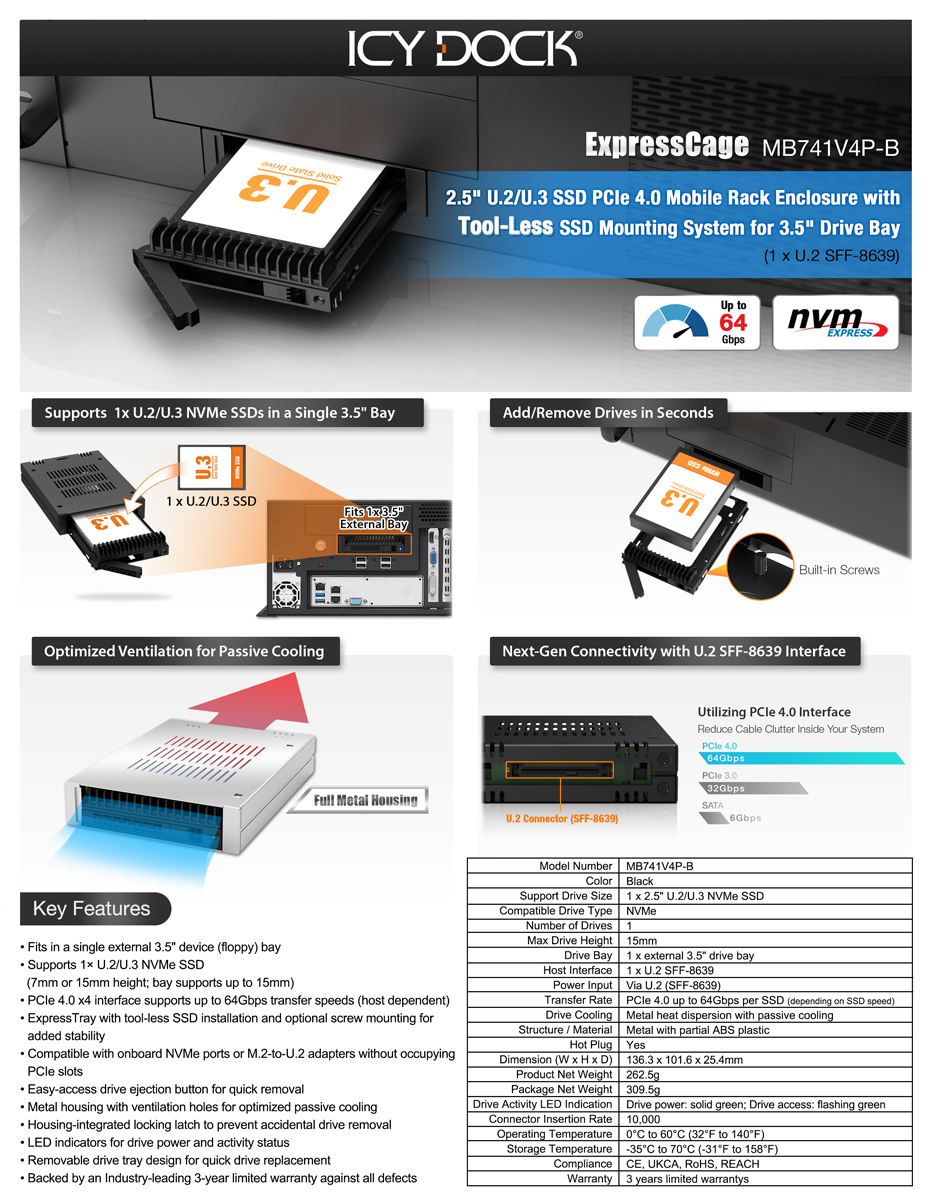 지원 드라이브 크기: | 1 x 2.5" U.2/U.3 NVMe SSD |