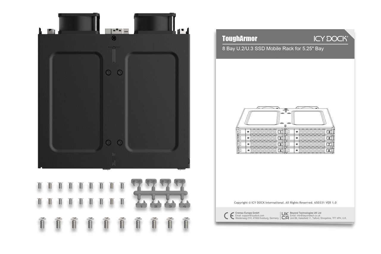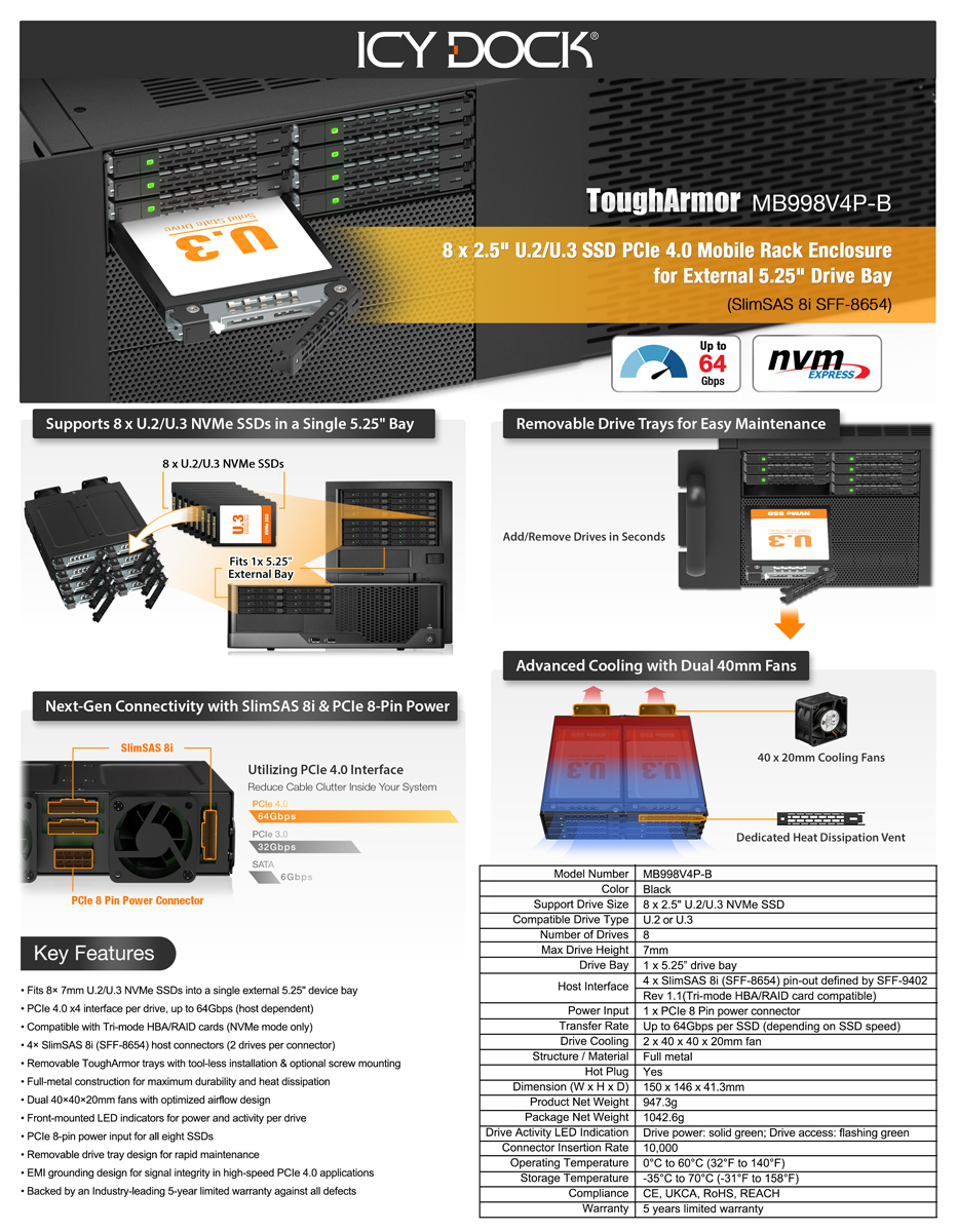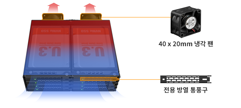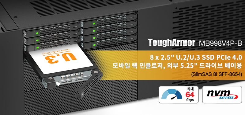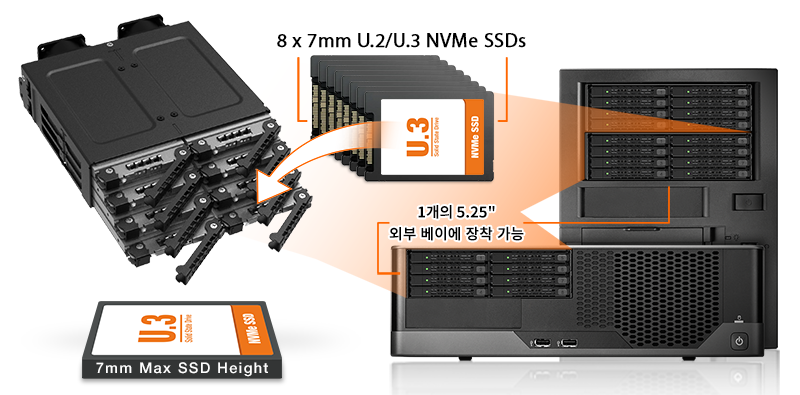 | • | 단일 외부 5.25인치 베이에 7mm U.2/U.3 NVMe SSD 최대 8개 장착 가능 |