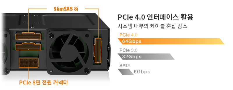 | • | 4개의 SlimSAS 8i(SFF-8654) 호스트 커넥터 (커넥터당 2개 드라이브 지원) |