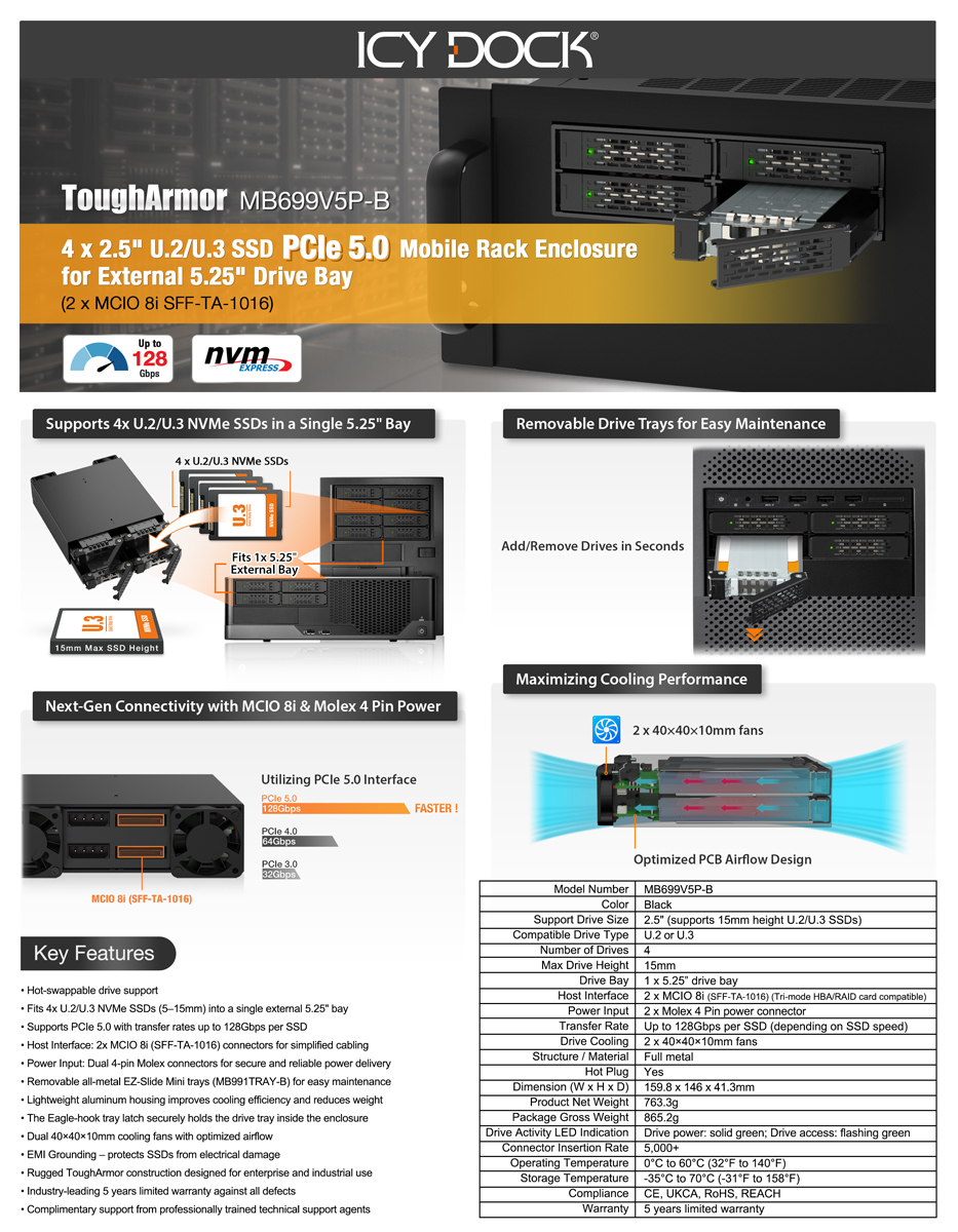 PCIe 5.0은 SSD당 최대 128Gbps의 전송 속도를 제공하며, MB699V5P-B는 PCIe 4.0보다 2배, PCIe 3.0보다 4배 빠른 대역폭을 지원합니다. 이러한 탁월한 속도는 다음과 같은 응용 분야에 완벽하게 적합합니다.