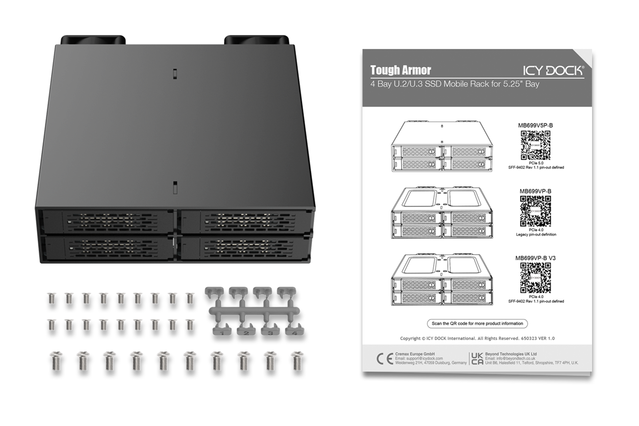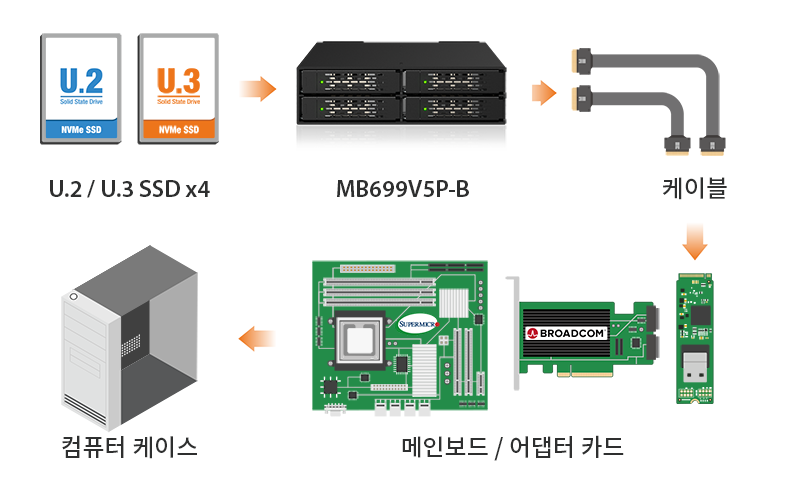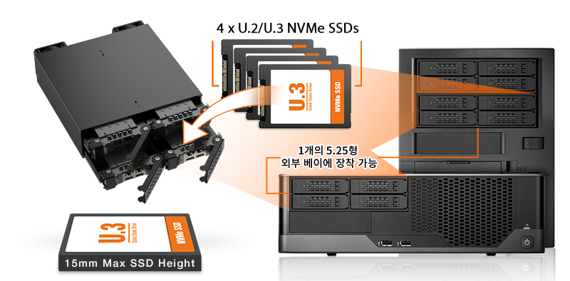 • | 단일 외부 5.25인치 베이에 4개의 U.2/U.3 NVMe SSD(5–15mm) 장착 가능 |