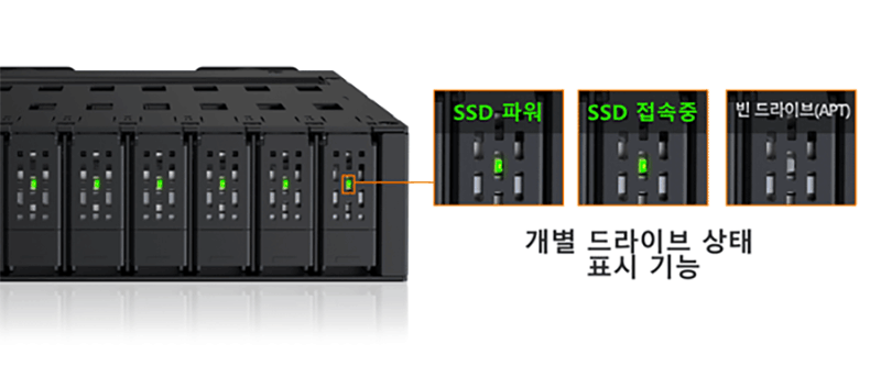 | LED로 SSD 작업 상태 표시 : | 디바이스 파워 온 : 녹색 디바이스 접속 : 녹색 점등 빈 드라이브 : LED 꺼짐 |
