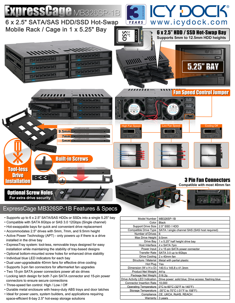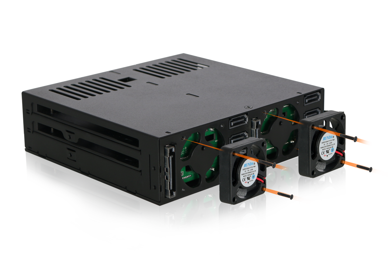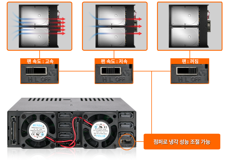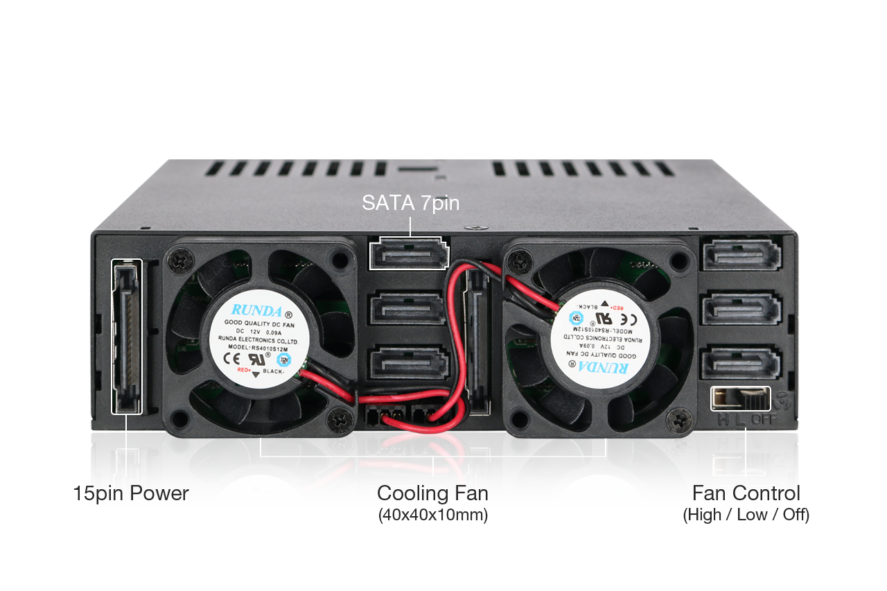 6개의 드라이브에서 발생하는 열 요구를 충족하기 위해 MB326SP-1B는 후면에 장착된 듀얼 40mm 냉각 팬과, 섀시 및 트레이 전반에 배치된 통풍 홀을 통해 효과적인 냉각 성능을 제공합니다. 사용자는 스위치 슬라이더를 통해 다음의 세 가지 팬 모드를 선택할 수 있습니다: