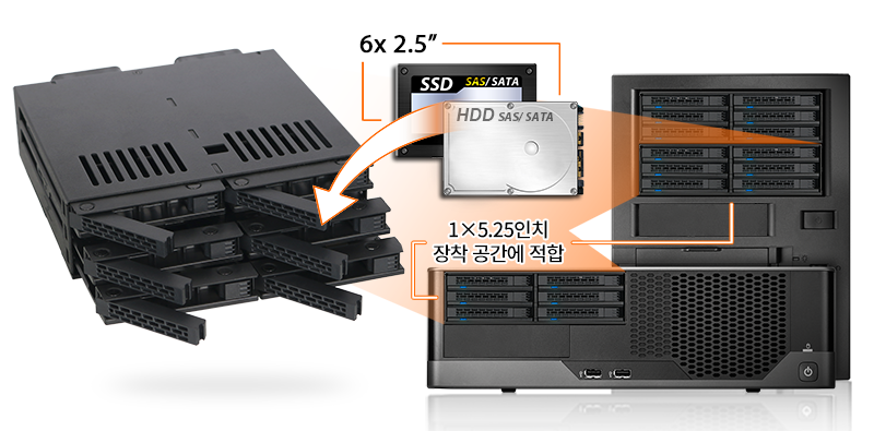 | • | 단일 5.25" 베이에 최대 6개의 2.5" SATA/SAS HDD 또는 SSD 장착 지원 |