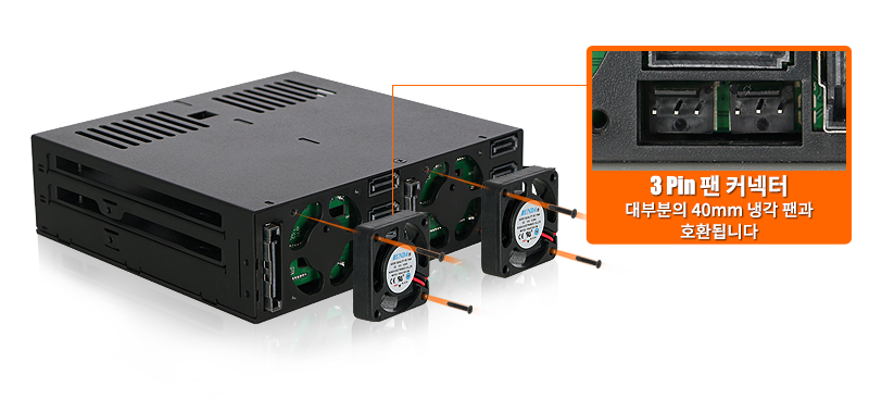 A: 저희가 사용하는 냉각 팬은 인클로저와의 호환성과 안정적인 작동을 위해 철저하게 테스트되었으며(일부 모델은 팬 속도 제어도 지원), 최적의 성능을 위해 기본 제공 팬 사용을 권장합니다. 다만 일부 환경에서는 기본 팬이 적합하지 않을 수 있어, 서드파티 팬 사용 시에도 보증은 유지됩니다. 단, 서드파티 팬으로 인해 제품에 전기적 손상이 발생할 경우 보증이 무효될 수 있습니다.
