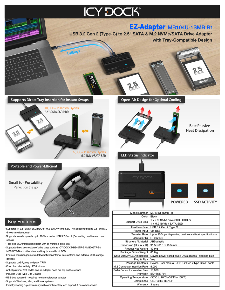 MB104U-1SMB R1은 다음과 같은 ICY DOCK 트레이와 완벽 호환됩니다: MB840M2P-B, MB840M5P-B, MB842MP-B, MB842M5P-B, MB852M2PO-B, MB872MP-B, MB873MP-B V2 등. 워크스테이션·서버에서 분리한 트레이를 그대로 USB에 꽂아 바로 데이터 확인, 테스트·백업·장애 점검 시간이 획기적으로 줄어듭니다.