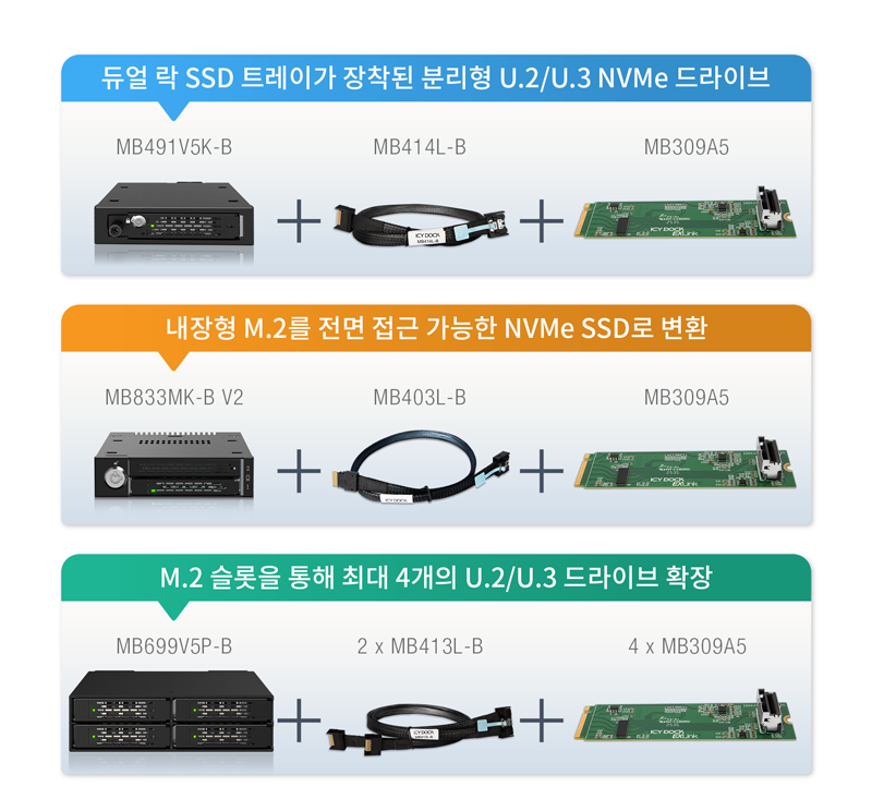 MB309A5는 ICY DOCK EXLink 에코시스템의 핵심 구성 요소로, 탈착식 NVMe SSD 솔루션의 구축을 간소화하도록 설계되었습니다. 단일 M.2 슬롯 업그레이드, 전면 접근형 U.2 구성, 또는 듀얼 드라이브 확장 구성 등 어떤 환경에서도 MB309A5는 ICY DOCK의 탈착식 스토리지 모듈 및 MCIO 케이블과 완벽하게 연동되어 즉시 사용 가능한 턴키 솔루션을 제공합니다.