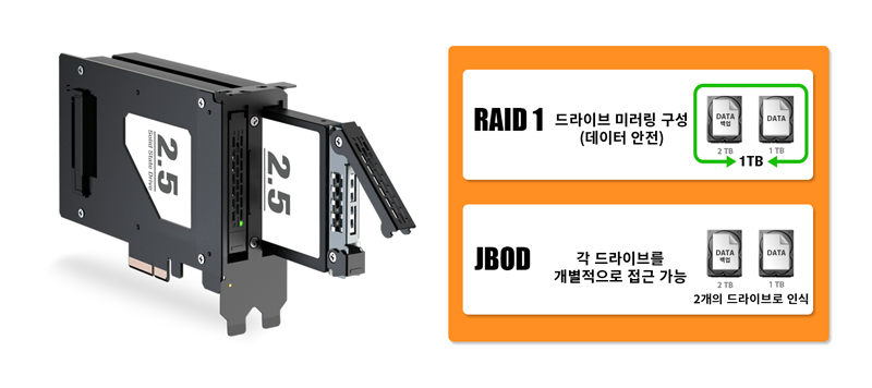 | • | 데이터 보호 또는 유연한 스토리지 구성을 위한 PCIe RAID 1 / JBOD 내장 지원 |