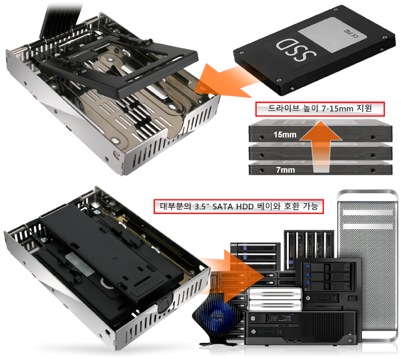| • | 2.5” SATA HDD / SSD to 3.5” SATA 하드 드라이브로 변환 | |